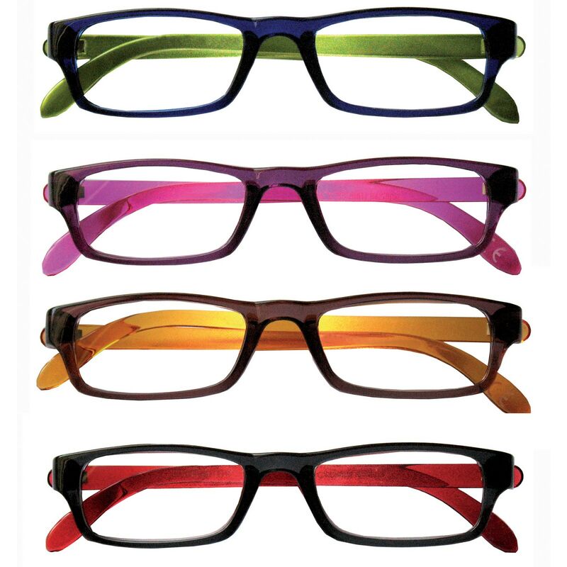 Mod.'rainbow'montatura in leggero materiale organico iniettato, lenti asferiche ultrasottili ed infrangibili. astine flessibili con meccanismo a molla. completi di astuccio in ecopelle. colori assortiti. diottrie 1