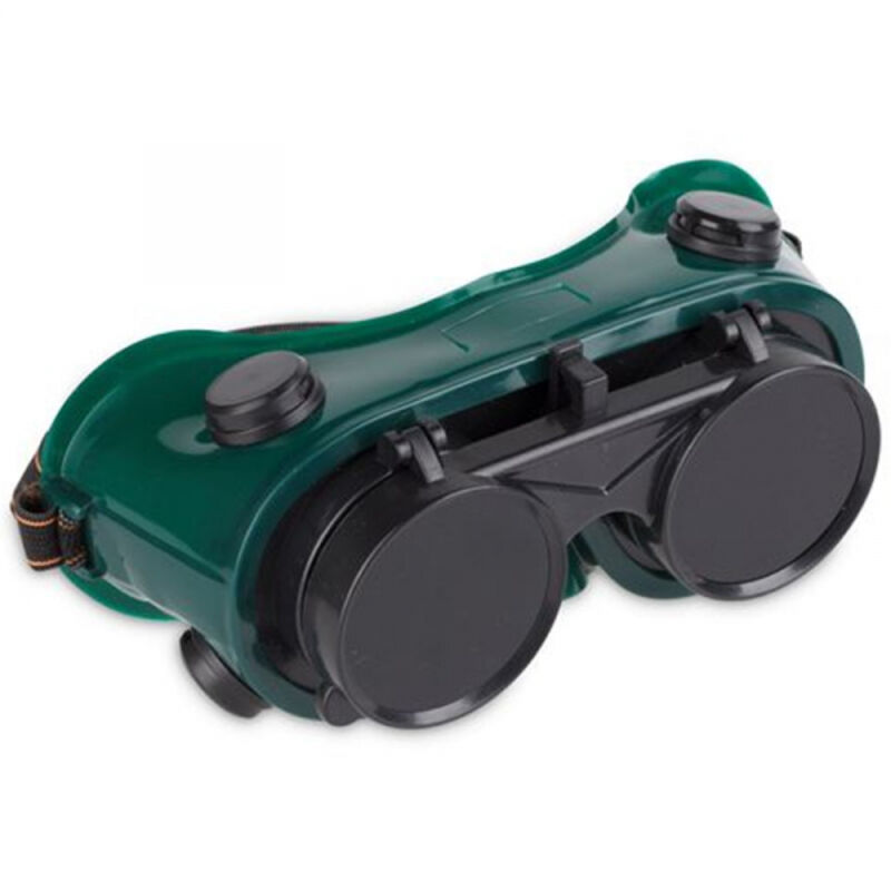 Occhiali per saldatura con struttura morbida e flessibile. Ventilazione indiretta tramite 4 valvole. Schermi di protezione per saldatura sollevabili. Fascia elastica regolabile. Conforme alle norme CE EN 175