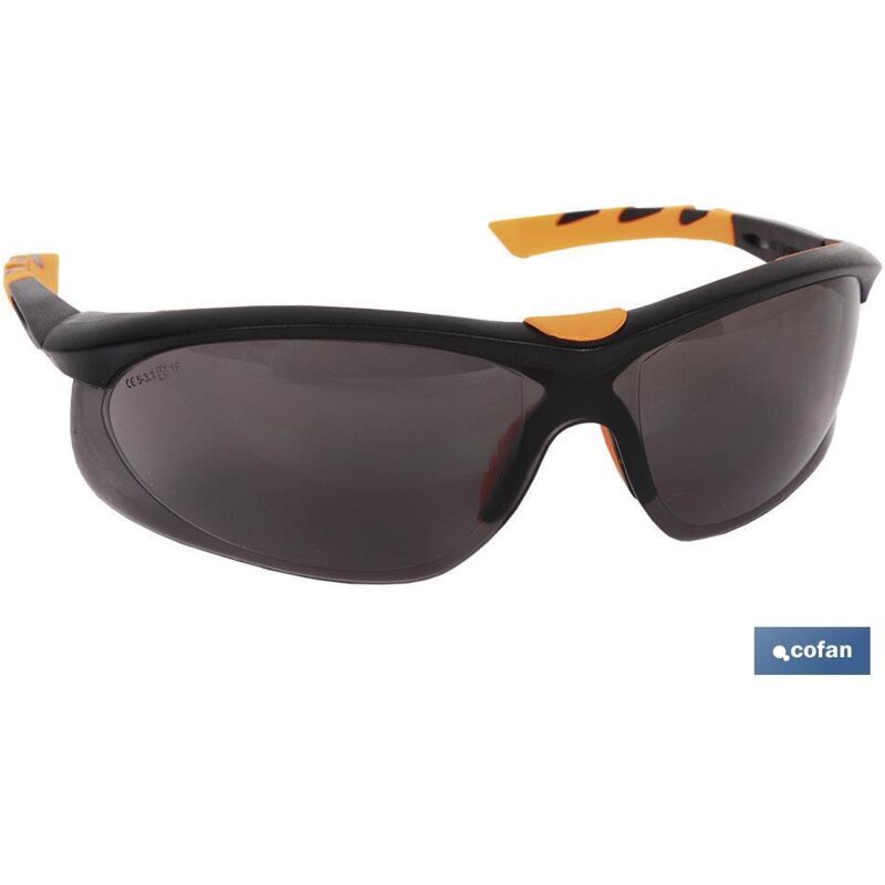Occhiali di sicurezza con lenti di protezione UV. Gli occhiali di sicurezza sono realizzati per proteggere in modo affidabile da particelle e raggi UV. Progettato con lenti scure che proteggono gli occhi dall'affaticamento durante il lavoro. Realizzato