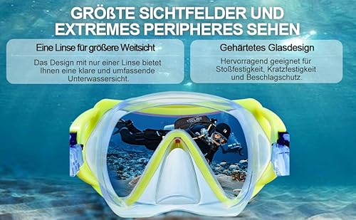 Lente chiara e vista panoramica: questi occhiali da immersione sono dotati di una lente monostrato in vetro temperato progettata per snorkeling, immersioni e gonne sono realizzate in morbido gel di silice trasparente anallergico, super visibile e insolita grazie a una singola lente. La cornice si estende in tutte le direzioni.