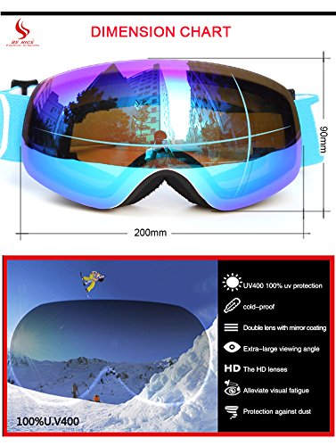 Lenti doppie: doppio obiettivo PC + UV, obiettivi rivestiti RENO, alta definizione, anti-nebbia, cecità anti-neve, design sferico sovradimensionato, campo visivo più ampio.(piccolo formato per i bambini: 90mm * 200mm, grande formato per adulti: 110mm * 260mm)
