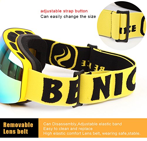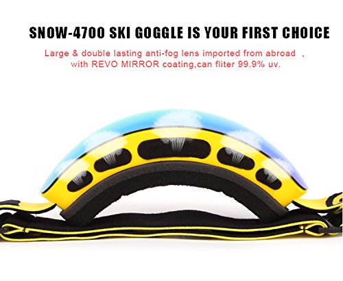 Occhiali da sci, KUGI Unisex Snowboard Skate Occhiali da Sci con lenti a specchio REVO - Lenti rivestite RENO, Alta definizione, Anti nebbia, cecità anti-neve Struttura TPU di fascia alta Protezione UV Lenti a scomparsa sferica a doppia larghezza PC + UV staccabile per bambini. (Yellow)