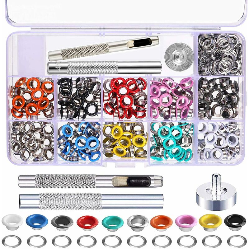 Il diametro interno dell'occhiello è di 5 mm. Il suo diametro totale è di 9 mm. Altezza: 3,8 mm. 10 colori misti: argento, bianco, nero, grigio, rosso, giallo, blu, verde, viola, arancione. Questi sono piccoli occhielli, il diametro interno è di 5 mm, simili alle scarpe da ginnastica con occhielli. Quindi, se vuoi usarli per una tenda da doccia, una tenda o un telo, assicurati che la dimensione sia quella di cui hai bisogno. Questi piccoli occhielli per tessuti e artigianato sono perfetti per realizzare occhielli per lacci delle scarpe, o creare fori di ventilazione in un cappello da sole o un berretto da baseball, o aggiungere un foro su borse di tela/cinghie della cintura. Questo strumento per occhielli con kit di occhielli con custodia è ideale per rifinire progetti artigianali fatti in casa o riparare vestiti, scarpe da ginnastica e scarpe da ginnastica. Sono inclusi 3 strumenti di installazione per praticare i fori e fissare gli occhielli . NOTA: devi usare il tuo martello o