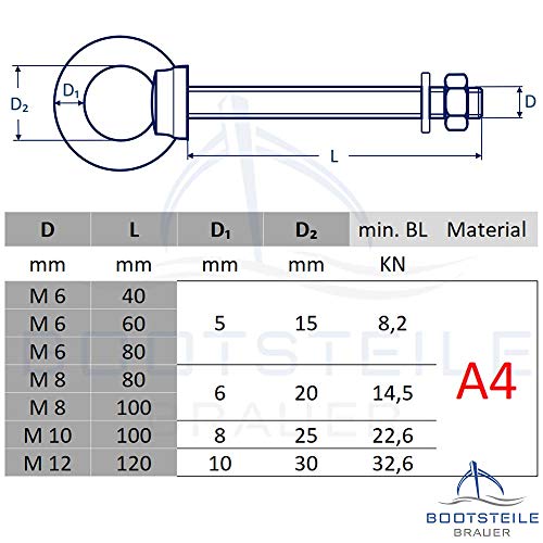 2 viti ad occhiello con filettatura metrica M6 x 80 mm - In acciaio inossidabile A4