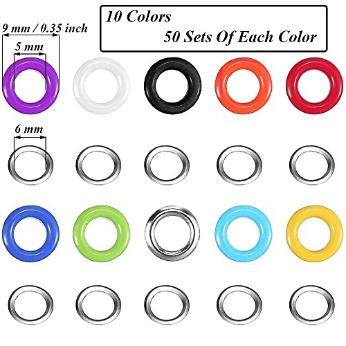 ★ La Confezione Include: I nostri occhielli per occhielli LWZko hanno 500 set in totale, con 10 colori diversi, nero, rosa, rosso, argento, grigio, blu, bianco, verde, giallo, arancione. 50 set di ogni colore. Dotato di strumenti di installazione, fresa per fori, mandrino e base abbinati. (Ogni set include 1 occhiello e 1 rondella).