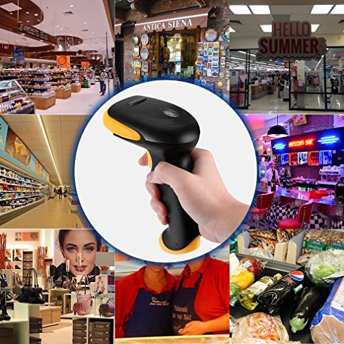 OCDAY, lettore di codici a barre, wireless, 2,4 GHz, Bluetooth, 4.0, portatile, scannerizzazione automatica per scansioni veloci e precise, cavo USB 2.0, ricaricabile con supporto regolabile senza l'uso delle mani per POS, computer, laptop, colore nero e giallo Blutooth