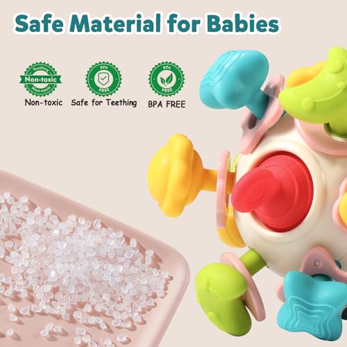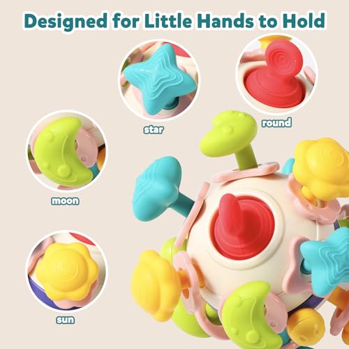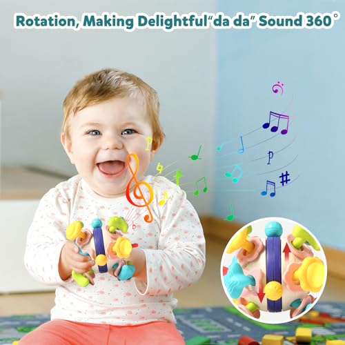【Giocattolo Montessori】Non solo può essere utilizzato come giocattolo per la dentizione, ma anche come sonaglio rotante. Questi giocattoli creano suoni divertenti e stimoli visivi mentre girano. Il sonaglio ha le dimensioni perfette per essere tenuto e agitato dalle mani dei più piccoli. Il giocattolo sensoriale è dotato di bolle di silicone comprimibili con linguette sulla parte superiore e inferiore, fornendo un ottimo esercizio per rafforzare le mani del tuo bambino.