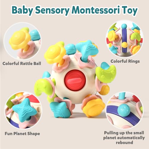 【Giocattoli per la dentizione del bambino】Interessante design a tema pianeta, forme diverse e colori interessanti. I morbidi punti da stuzzicare combinano le funzioni dei sonagli per bambini e dei giocattoli da dentizione per aiutare ad alleviare la dentizione. La pallina centrale emette piacevoli fruscii per distrarre e calmare il bambino. Molto adatto per lo sviluppo multistadio dei bambini da 0 a 12 mesi.