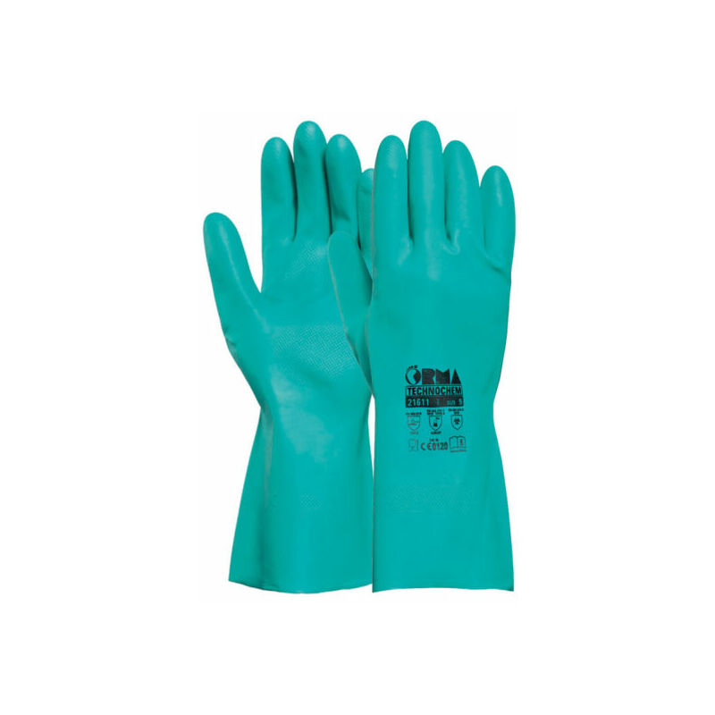 GUANTI CHIMICI Guanto in nitrile verde resistente ad una vasta gamma di solventi, acidi, basi ed idrocarburi. L' interno floccato garantisce una migliorata traspirabilità, la diminuzione del rischio di irritazioni cutanee ed un eccellente comfort senza interferire con la destrezza. La finitura del palmo piramidale migliora il grip e la presa sia su oggetti/superfici bagnate sia asciutte. Ottima resistenza all' abrasione. Senza silicone nel processo produttivo e certificato per il contatto con alimenti. Taglia: 8,9 Lunghezza: 330 mm