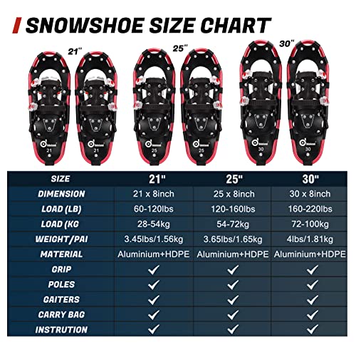 Odoland Racchetta da Neve Set 4-in-1 per Uomo e Donna, Ciaspole da Neve con Bastoncini da Trekking, Ghette per Gambe per Neve Impermeabile e Borsa da Trasporto, Rosso, L:76.2 cm 72-100kg