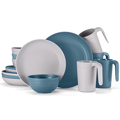 Odoland Stoviglie da Campeggio, Set di Piatti Tazze in Plastica 16 Pezzi per 4 Persone, Leggeri e Riutilizzabili, Set Piatti Ciotole Insalata, Blu e Grigio