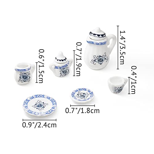 Dimensioni (LxPxA): Teiera 2,6x2x3,4 cm, Zuccheriera 2x1,3x2 cm, Caraffa di latta 1,6x1,3x1,4 cm, Piatti 2,5x2,5x1,4 cm, Tazza 1,6x1,2x0,9 cm, Piattino 1,7x1,7x1,7 cm
