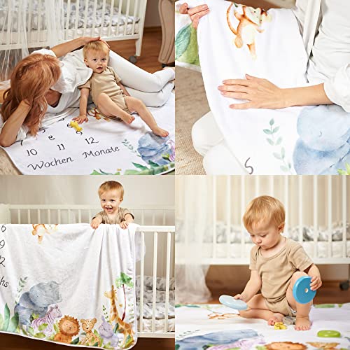 ODOXIA Coperta Mesi Neonato In Tedesco | Tappeto Mesi Neonato Per Maschio O Femmina, Unisex | Tema Safari | Regalo Baby Shower Personalizzato Per Neomamme | Copertina Mesi Neonato | Incluse Cornici
