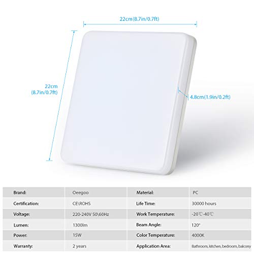 Oeegoo 15W IP44 Sensore radar Lampada per interni incorporato angolo di rilevamento di 180° raggio d'azione da 4 a 12 m LED Plafoniera 1300LM- Equivalente 75W Quadrata (4000K)