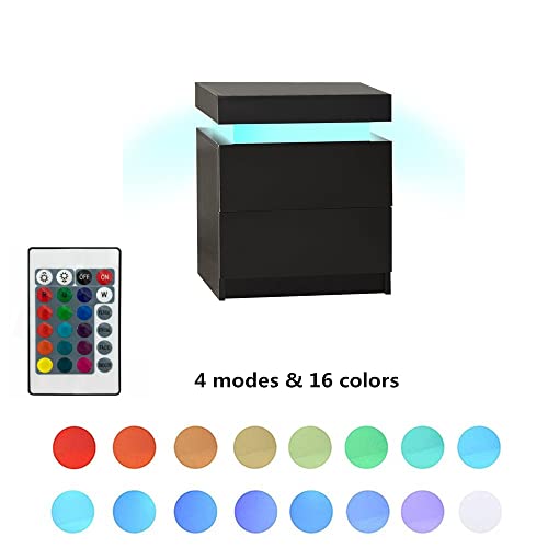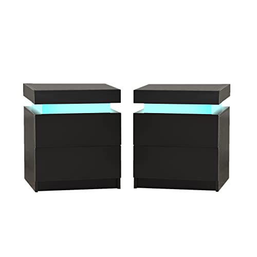 OFCASA Set di 2 comodini con luci LED superiori, 2 cassetti, nero lucido e opaco per camera da letto
