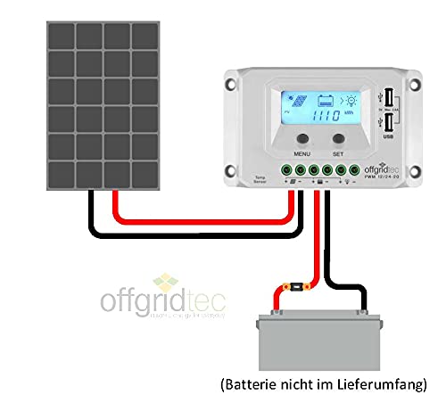 Contenuto della confezione: pannello solare Mono Offgridtec da 100 W, gel di carica PWM-Pro con display LCD, uscita di carico e prese USB con istruzioni in tedesco e inglese - Cavo di collegamento modulare 8 m 2 x 6 mm² - 1,5 m cavo di collegamento per batteria con fusibile, capicorda M8 e morsetti per batteria - Set di tenuta in bianco 55 cm con viti in acciaio inossidabile e installazione. istruzioni in tedesco in tedesco (lingua italiana italiana Passacavo con raccordo a vite PEG in bianco
