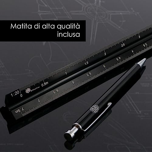 OfficeTree Scalimetro Professionale incl. Matita Meccanica - Righello Triangolare 30 cm - Scala da 1:20 a 1:125 - Scalimetro Alluminio - Righello Alluminio 30 cm - Righello Architetto e Studenti