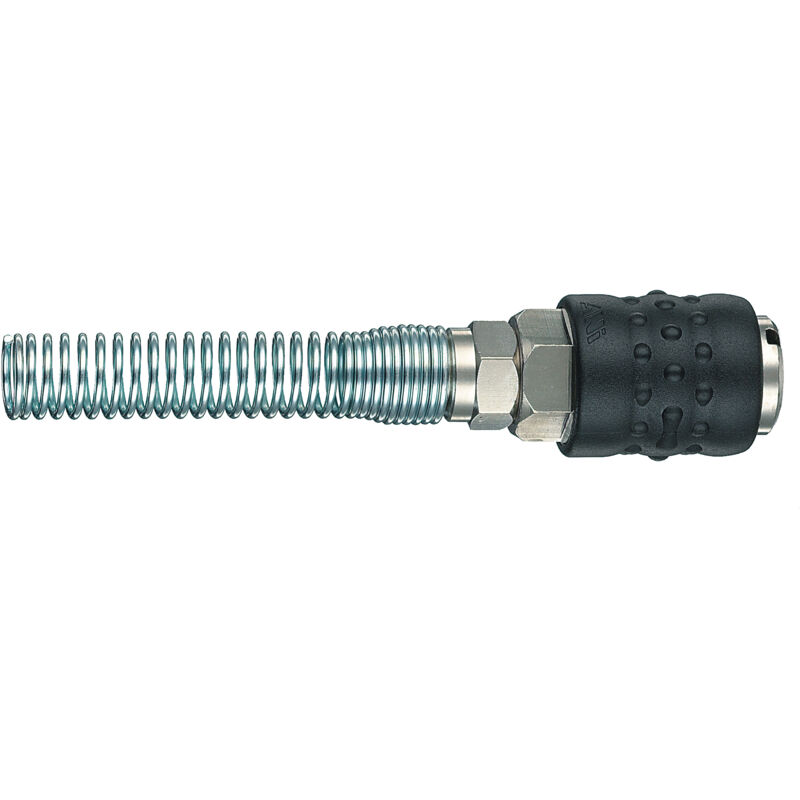 Art. 64 MF innesto per rubinetto rapido con molla a spirale. Sezione 8x10 mm. Pressione max consigliata 18 bar. Corpo e dado di bloccaggio in ottone nichelato, molla in acciaio armonico zincato 70 mm. Garnizione in gomma antiolio NBR esenti da silicone. Lunghezza 120 mm. Peso 112 g. Blister.