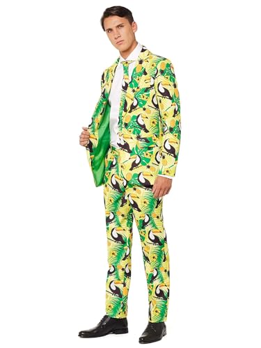 VERDE TROPICALE: stai cercando vestiti divertenti per uomini? Questa tuta verde hawaiana con uccelli (tucani) e fiori è un outfit ideale per diverse occasioni, come un addio al celibato, Halloween, un ballo, una festa estiva o una festa a tema hawaiano. Vestiti per stupire!
