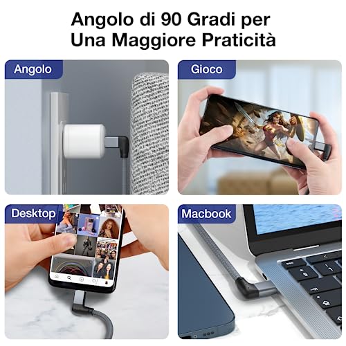 【Cavo USB C 90 Gradi】Cavo USB Type-C android 100w è progettato con un angolo retto, rendendo più facile e conveniente per gli utenti giocare, guardare video e leggere e-book durante la ricarica. cavo USB Type-C 90 gradi è dotato di un chip e-mark per una ricarica più sicura;