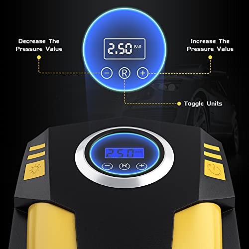 FACILE DA USARE - Collegare la spina dell'accendisigari all'auto, dopo aver scelto la pressione e collegare la punta alla valvola del pneumatico, infine premere il pulsante di avvio, questo gonfiatore per pneumatici per auto da 12 V inizia a gonfiarsi.
