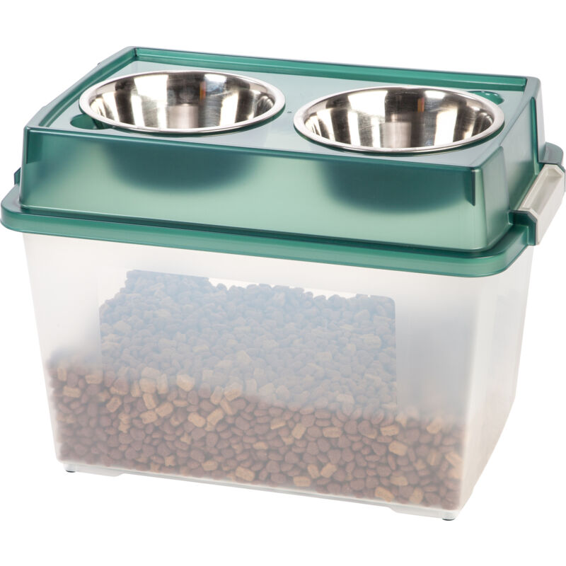 Perfetta per i viaggi o per ogni stanza della casa grazie alla sua funzionalità pratica, questa doppia ciotola 2 in 1 della gamma FS-L di Iris Ohyama permette al tuo animale di abbeverarsi e nutrirsi favorendo la digestione. Infatti, il suo supporto rialzato ha una funzione anti-vomito. La scatola di stoccaggio per crocchette integrata, con chiusure a clip e di colore trasparente, ti permette di riapprovvigionare e dosare facilmente la ciotola. Ogni mangiatoia per cani e animali domestici viene fornita con 2 ciotole in acciaio inossidabile (un recipiente per l'acqua, l'altro per il cibo) che si adattano perfettamente al supporto e al contenitore della ciotola. Inoltre, questo articolo è realizzato in materiali di plastica (PP) senza BPA per un uso di lunga durata e di qualità.