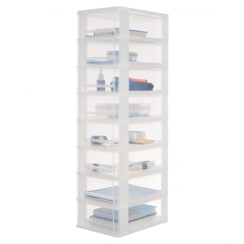 Le torri DDOCH sono progettate con materiale trasparente che consente di trovare facilmente ciò che si sta cercando, in quanto il contenuto è facilmente identificabile. Tutti i cassetti sono dotati di maniglie integrate per facilitare l'apertura e la chiusura. I cassetti sono inoltre dotati di un fermo per evitare che cadano. Grazie alle loro dimensioni compatte e al loro design, possono essere inserite in qualsiasi stanza della casa per diversi tipi di stoccaggio, sia che si tratti di oggetti per l'ufficio che possono essere posizionati in cima alla torre, sia che si tratti di vestiti, queste torri possono essere utilizzate nella vita quotidiana. ? IL PRODOTTO CONTIENE: 1 torre di stoccaggio - Made in France ? DIMENSIONI: Esterno: 26 x 35,5 x 96,5 cm (L x P x A) - Interno (cassetto): 31,5 x 21,5 x 10,5 cm (L x P x A). ⚖️ CAPACITÀ: 8 cassetti da 7 L. Le torri DDOCH ti consentono di riporre facilmente tutti i tipi di oggetti utilizzando un piccolo spazio in casa grazie alle sue