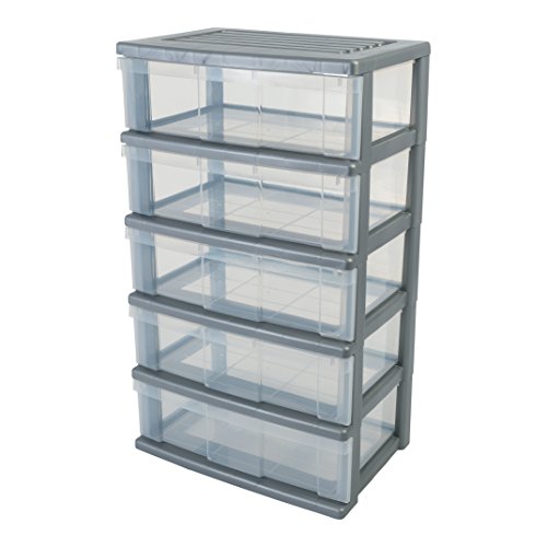 Iris Ohyama, Torre di stoccaggio, Organizer in plastica, 5 casseti da 34 L, Ruote, Materiale robusto, Ufficio, Garage, Camera da letto, Capannone - Wide Chest WC-N605 - Argento
