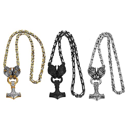 OIDEA Collana Uomo Testa di Lupo Doppia Prepotente Ruvida in Acciaio Inossidabile Amuleto Vichingo Norvegese Collana con Ciondolo Martello di Thor Catena Bizantina in Argento Nero Dorato