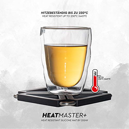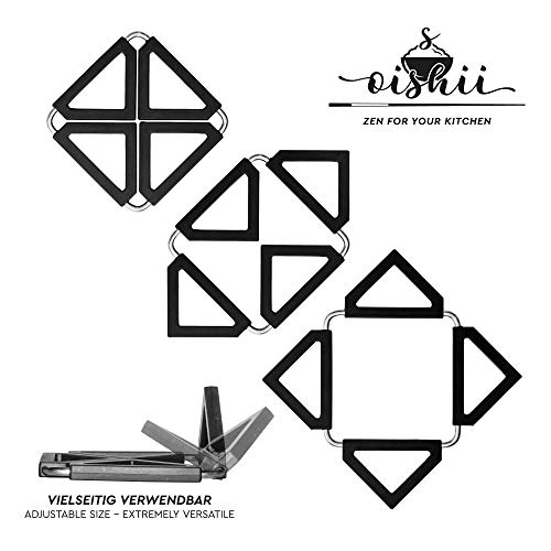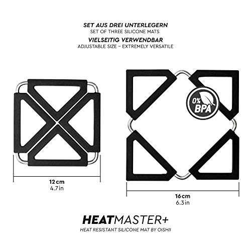 Oishii Heatmaster - Set di 3 Sottopentola allungabile, Silicone e Inox, resistenti al calore, 12x12-22x22cm, Colore negro