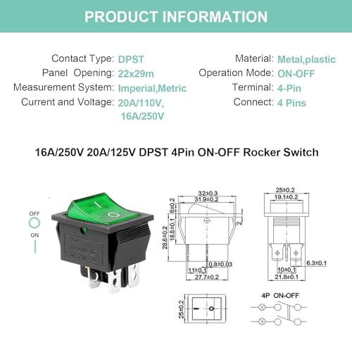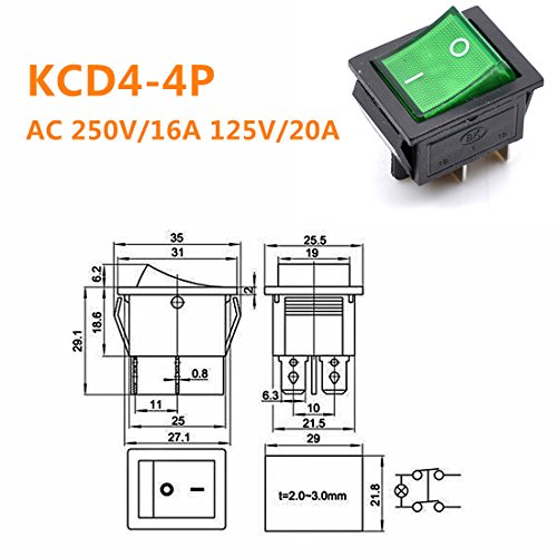 Oiyagai 10 Pezzi Interruttore a Bilanciere DPST 4 Pin con Luce Verde, Pannello On-Off, 16A/250V 20A/125V KCD4