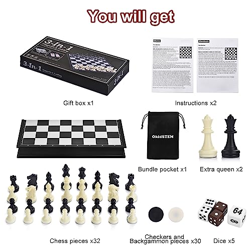 OkidSTEM 3 in 1 Magnetico Scacchiera/Backgammon/Dama, Gioco da Viaggio con Tavola Scacchi Pieghevole (Classico)