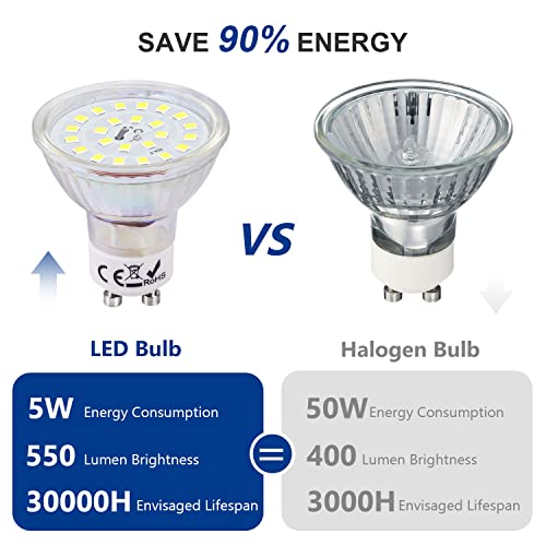 Risparmio energetico: Lampadine GU10 LED luce freddo funziona alla stessa potenza di una lampada alogena da 50W, ma consuma meno elettricità di una lampada alogena, risparmiando almeno il 90% dell'elettricità in casa. La luce durante il lavoro è morbida e distribuita in modo uniforme, illuminando senza irritare gli occhi.