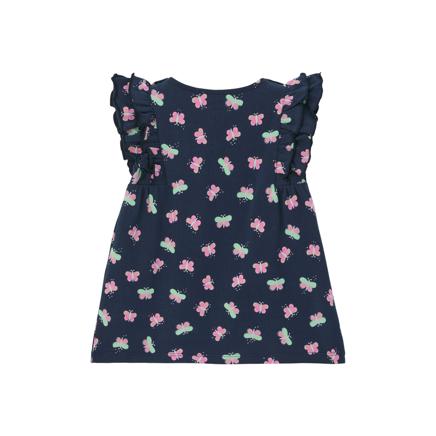 Dettagli del prodotto: Abito a farfalla Allover print Senza maniche Scollo con due bottoni a pressione laterali Volant Materiale e cura: Materiale: 95% cotone, 5% elastan Lavabile fino a 40° C Non adatto all'asciugatrice Non stirare a caldo