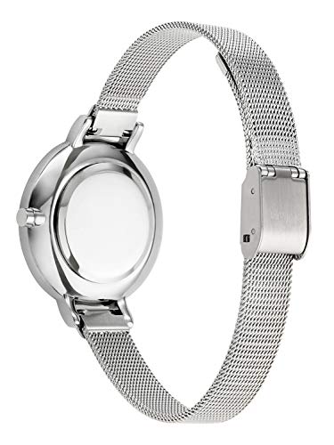Cassa in metallo lucidata con pietre sugli impulsi Fondello, chiusura pieghevole e corona in acciaio inossidabile Fascia milanese in acciaio inossidabile Vetro minerale antigraffio Dimensione della cassa: 33 mm Larghezza di banda: 10 mm Lunghezza del nastro: 90 x 115 mm Resistenza all'acqua: 3 ATM Confezionato nella confezione regalo originale s.Oliver 2 anni di garanzia