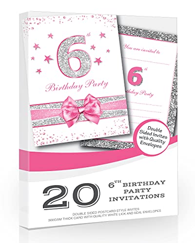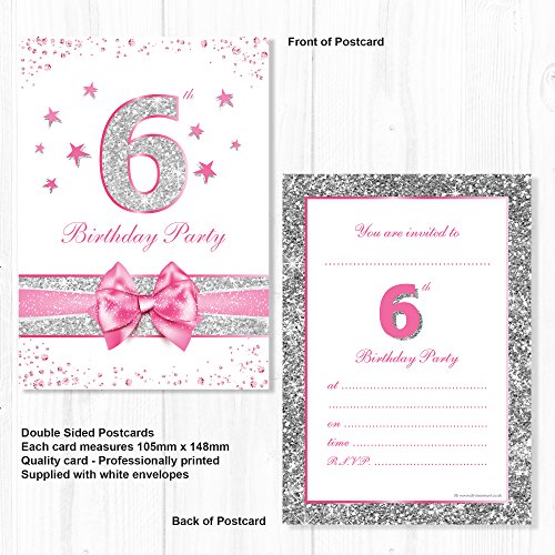 Olivia Samuel, 20 inviti per festa di compleanno per il 6° compleanno, rosa con glitter argentati, formato A6, formato cartolina con buste.