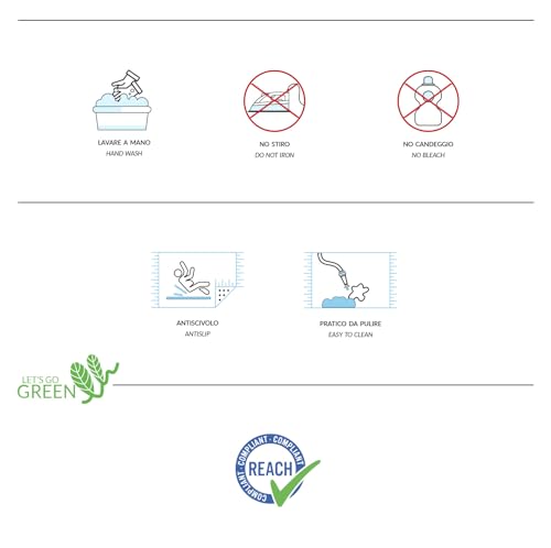 Fondo antiscivolo e bordo anti inciampo in pvc. Base in polipropilene morbido al tatto.