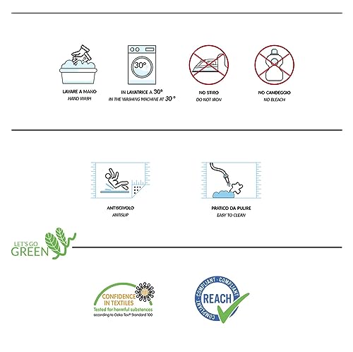 Prenditi cura del tuo tappeto: IL TAPPETO È LAVABILE A MANO O A MACCHINA A 30°. NON CANDEGGIARE. NON STIRARE. NON LAVARE A SECCO.