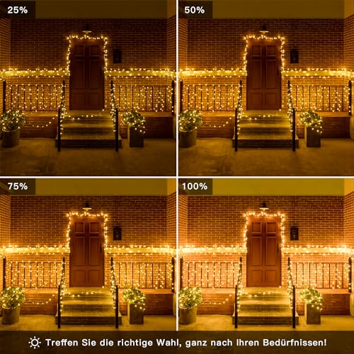 【8 modalità e 4 livelli di luminosità】 La catena luminosa a LED esterna con spina europea ha 1 luce permanente + 7 diverse modalità lampeggianti e 4 livelli di luminosità. La modalità e la luminosità sono selezionabili in base all'ambiente e all'umore. Darti più opzioni.