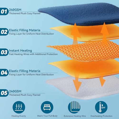 【Morbido e caldo】 La coperta elettrica è realizzata in flanella 240 GSM super morbida e confortevole Questa coperta elettrica misura 180 x 130 cm (51 x 71 pollici). I fili di riscaldamento elettrico di alta qualità sono distribuiti uniformemente all'interno della coperta elettrica e fissati strato dopo strato. Impedisce il movimento del filo riscaldante e distribuisce il calore in modo uniforme. Ti porta calore e comfort, mantenendo il corpo o il letto caldo prima di addormentarti