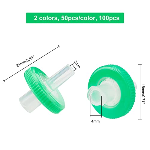 【Riferimento alle dimensioni】--La confezione include 100 filtro per siringa di cui 2 colori (50 pezzi/colore), misura in circa 0.71" (18 mm) di diametro, 0.83" (21 mm) lungo