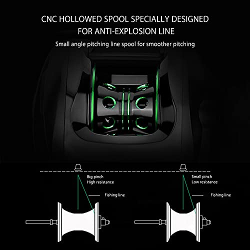 Prestazioni-6.3: 1 rapporti di trasmissione Golden sono adatti per la maggior parte delle specie di esche. 12 cuscinetti a sfera lisci resistenti alla corrosione e un cuscinetto anti-inversione a senso unico per una performance ultra liscia. Mulinelli da casting con bobina in alluminio CNC Super Light.