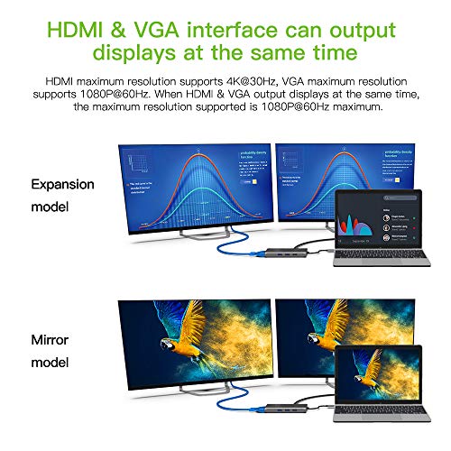 ✔️[Uscita video HDMI e VGA 2] - Queste due porte più comuni al mondo offrono un'ampia compatibilità, è possibile visualizzare l'immagine su quasi tutti i monitor, TV 4K o monitor vecchi. HDMI: 4K (3840 x 2160) @ 30Hz, VGA: 1080P (1920 x 1080) @ 60Hz (Quando si utilizza l'uscita HDMI e VGA contemporaneamente, supporta solo la modalità mirror, Jack da 3,5 mm non funziona mentre si utilizza l'uscita HDMI.)