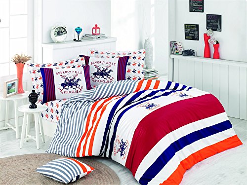 BHPC Beverly Hills Polo Club set biancheria da letto king size Linen federa 100% cotone rosso arancione blu a righe bianco cavallo Sport elegante scatola regalo 220 x 240 cm 176bhp42212