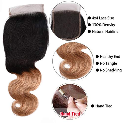 10A Ombre Brazilian Body Wave 3 Bundles with Closure 2 Tone Ombre Hair Extensions with Lace Closure Brazilian Virgin Human hair Weft Natural Black to Brown (14 16 18+14 inches)