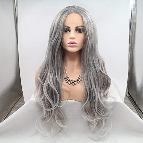 Ombre grigio chiaro sintetico pizzo anteriore parrucche amichevoli sicurezza capelli lunghi sintetici grigio pastello, parrucca da donna per cosplay, feste, viaggi, 64 cm (grigio chiaro ombre)