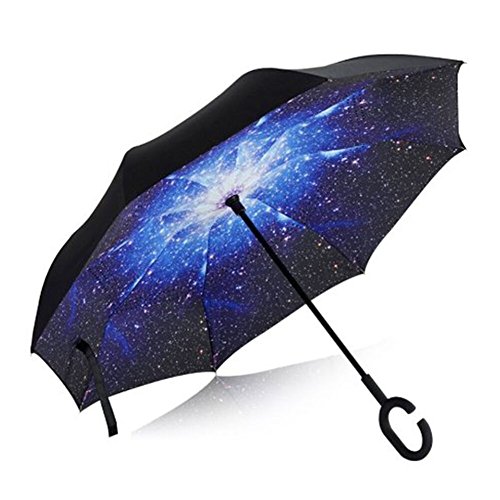 AIQI - Ombrello reversibile a doppio strato, impermeabile/protezione UV/antivento, con manico a forma di C per lasciare le mani libere, perfetto in viaggio e in auto bianco Starry Sky