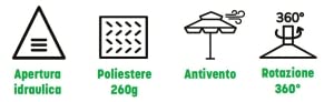 Apertura automatica idraulica. Questo sistema di apertura tramite un pistone idraulico permette una grande facilità di apertura dell'ombrellone da giardino. E' sufficiente sbloccare il meccanismo e l'ombrellone si apre automaticamente.