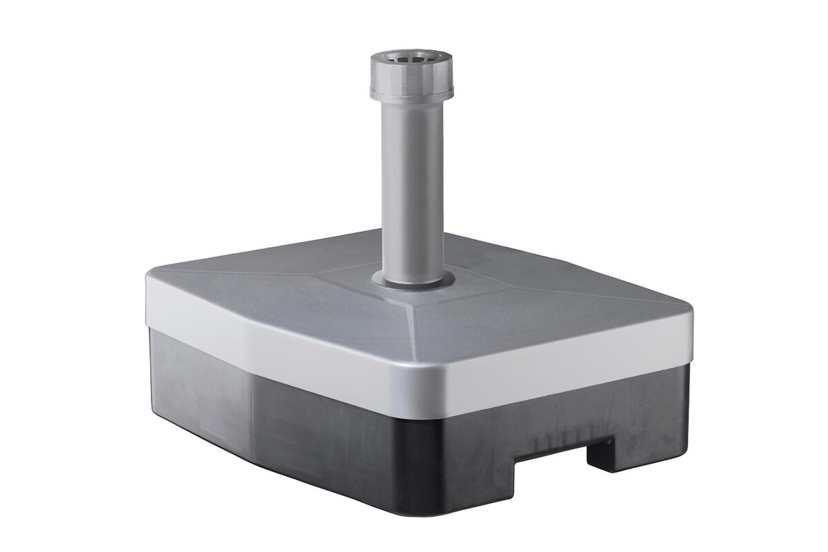 In plastica, colore nero. Da riempire con 40 Kg di sabbia. Adatto ad ombrelloni con palo da 21 a 54 mm