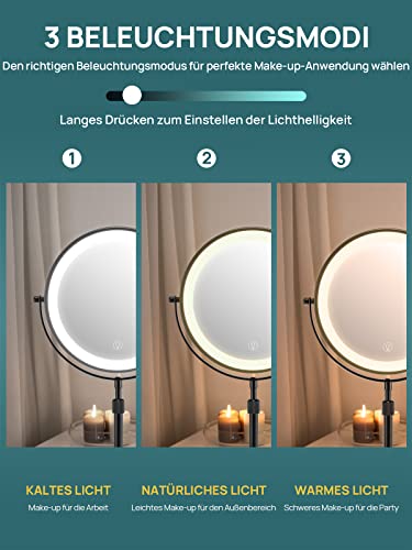OMIRO Specchio Cosmetico Ingranditore 3X/10X con Illuminazione, Specchio da Trucco a Doppio Lato Girevole 21cm, Specchio Ingranditore Doppia Faccia, con Supporto Regolabile in Altezza (Nero)